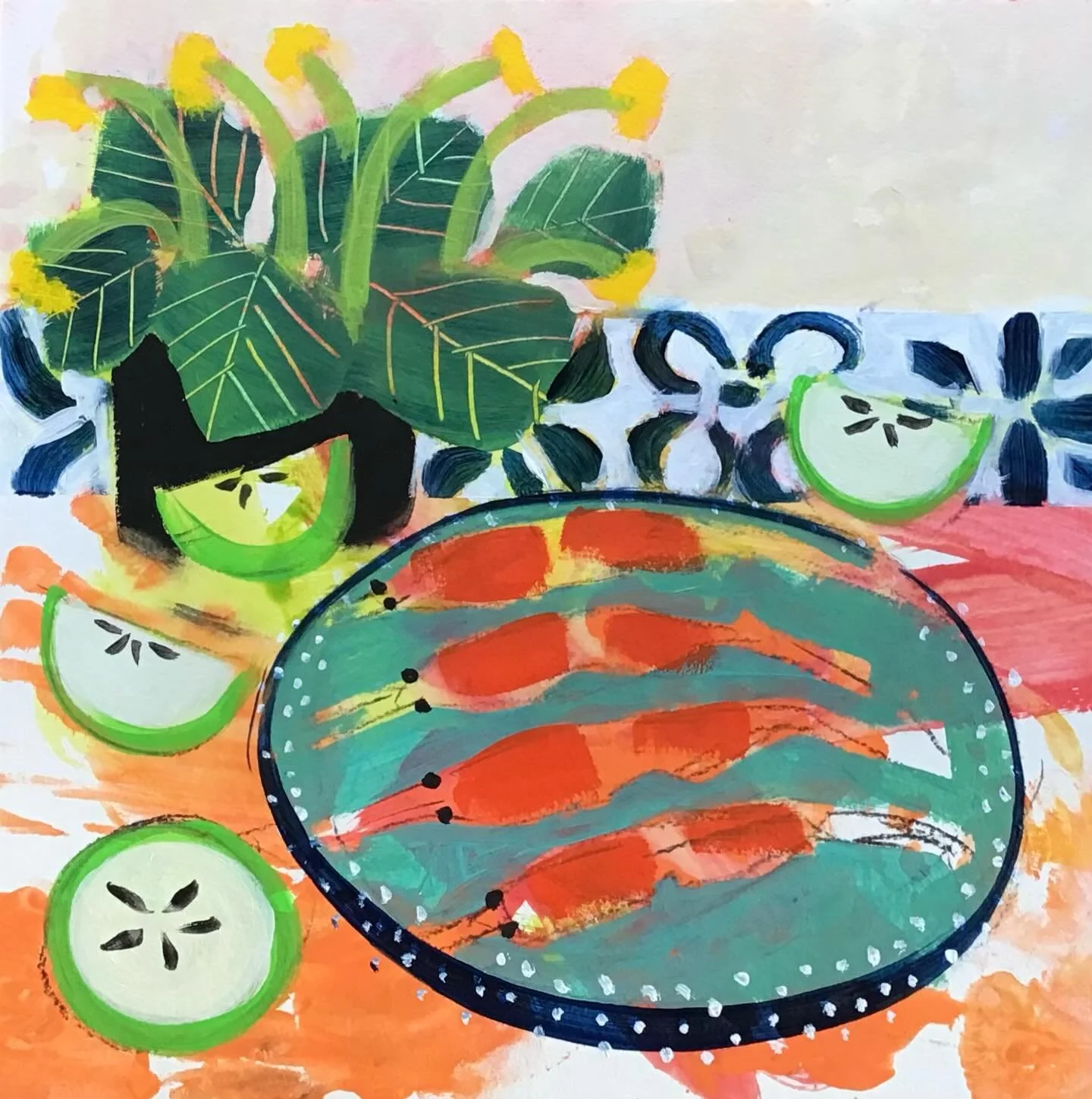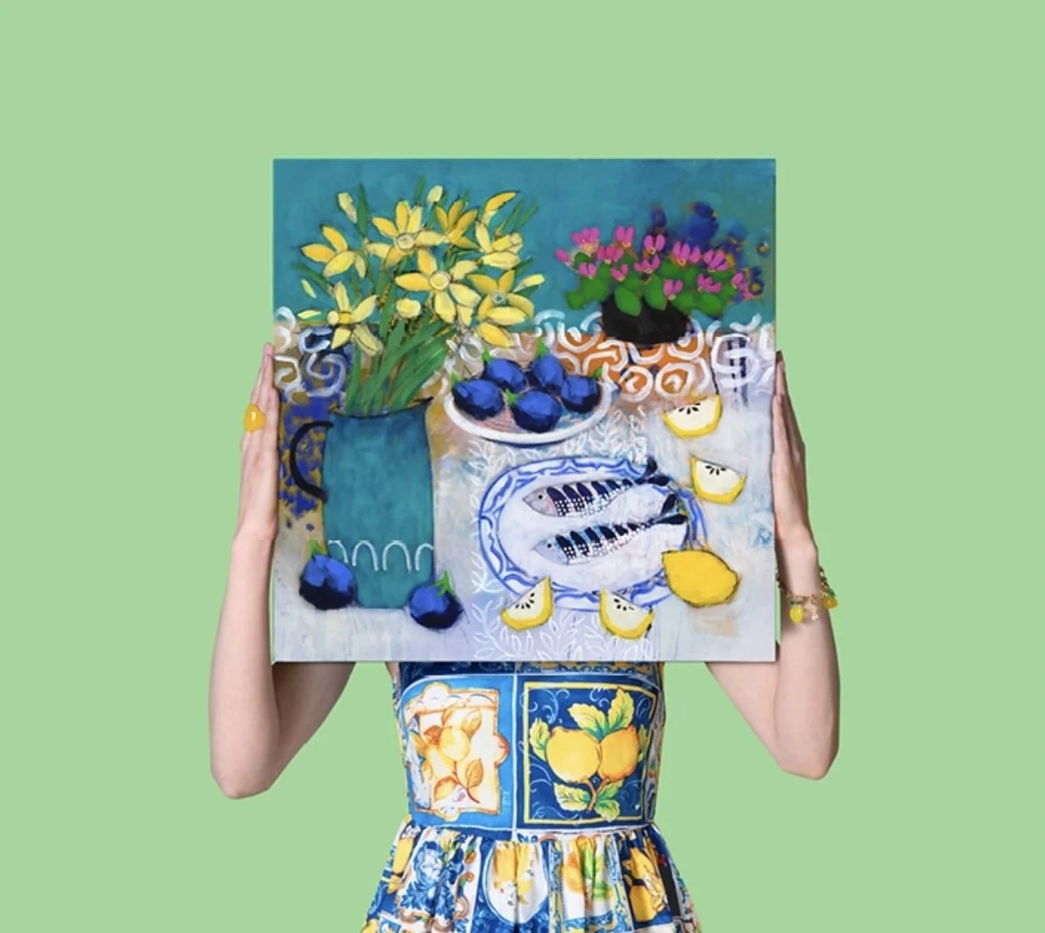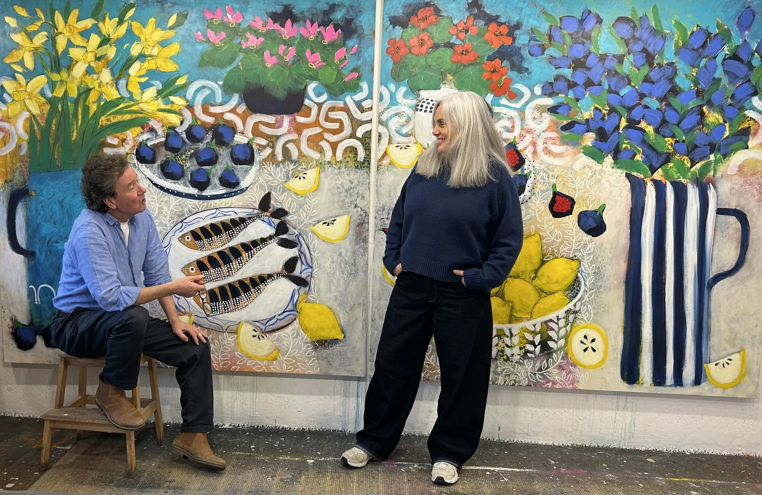 We are Christine Relton and Tom Marine and have been making paintings collaboratively since 1996 as RELTON MARINE. We paint together on the same canvas and have developed a distinctive style of painting unique to us. Our inspiration is colour, colour and more colour, with travel, ceramics, textiles and landscape as constant themes and a belief that there’s no such thing as too much but with a rigorous eye to composition and keeping it all together. Our only intention is for you to feel happy and uplifted when you look at the paintings and see the fun we had making them.